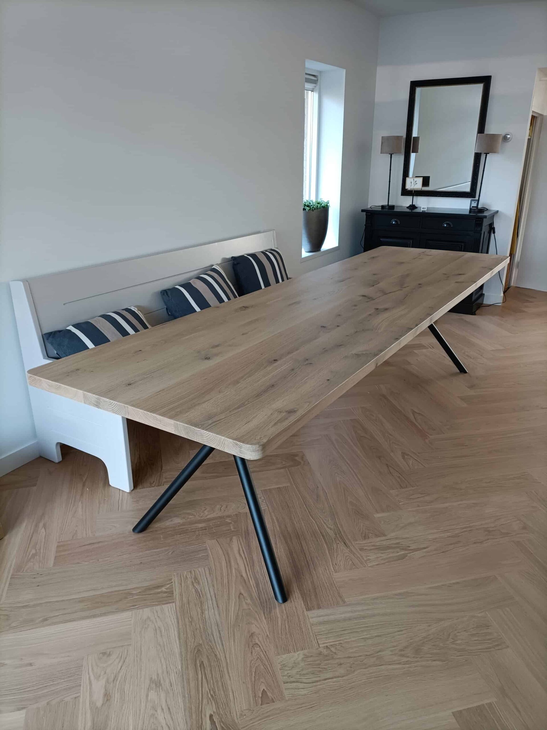 Deze prachtige eiken tafels kunnen in verschillende maten en modellen worden geleverd tot standaard 3 meter! Een langere tafel is ook mogelijk.