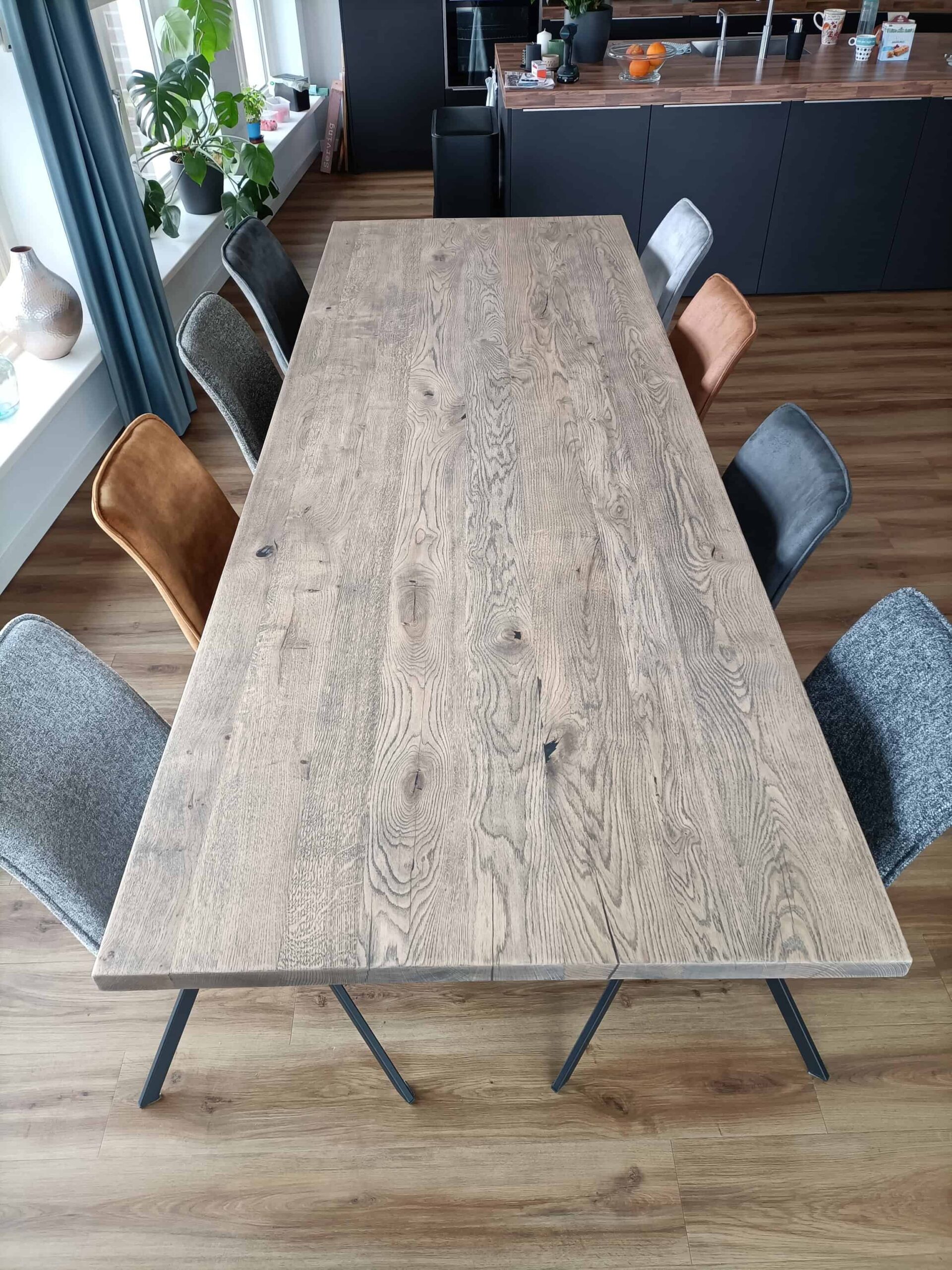 Voor onze tafels worden planken van 4 cm massief eiken gebruikt, zodat de structuur van het hout mooi te zien is.